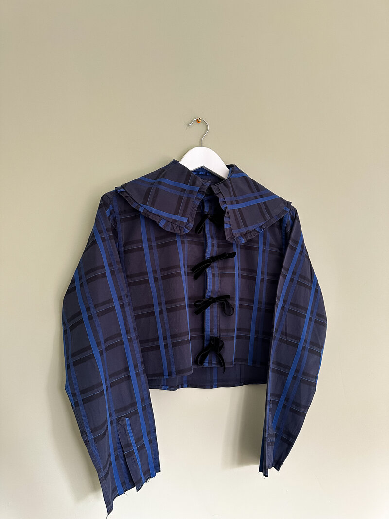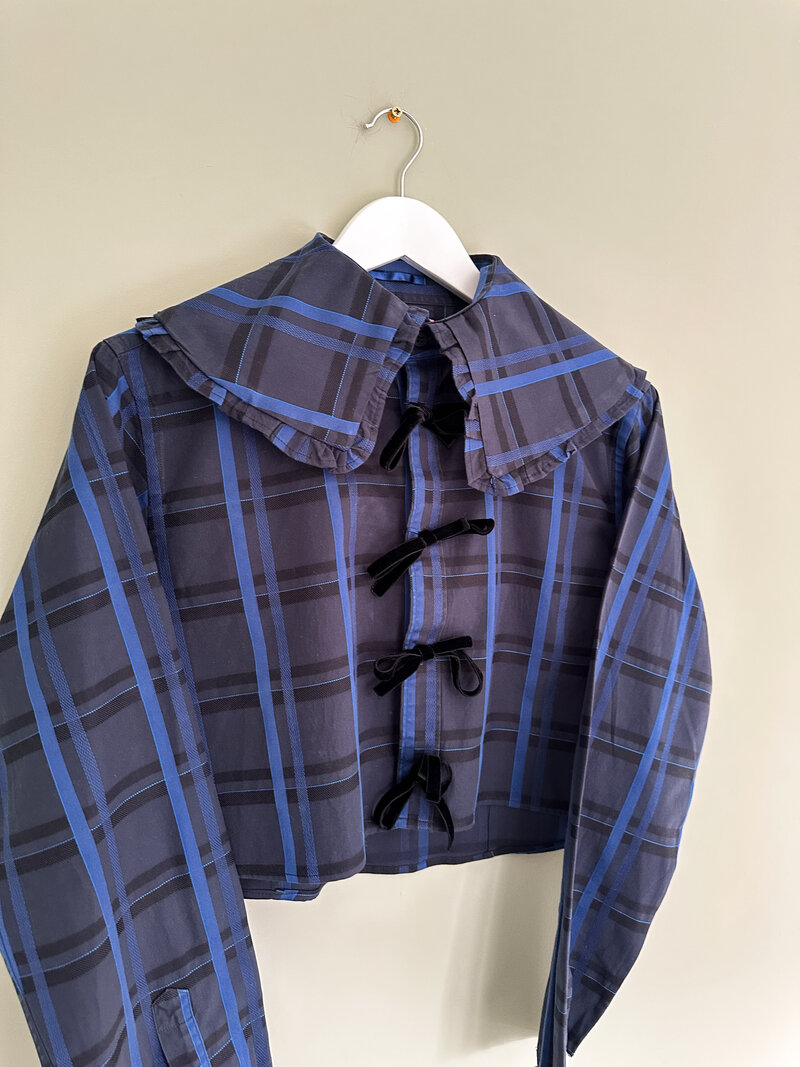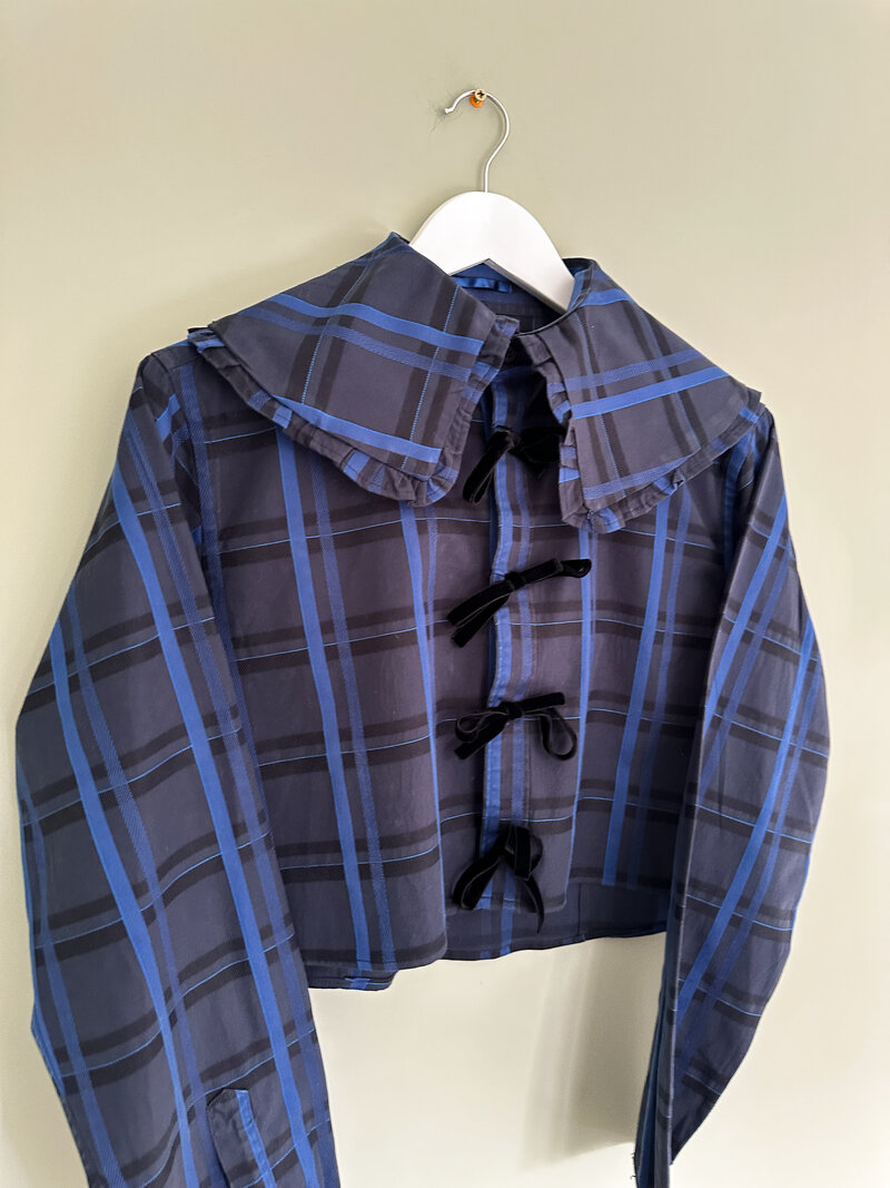 Tartan shirt with black velvet bows and a big collar, cropped length perfect for wearing with high waisted jeans and trousers.