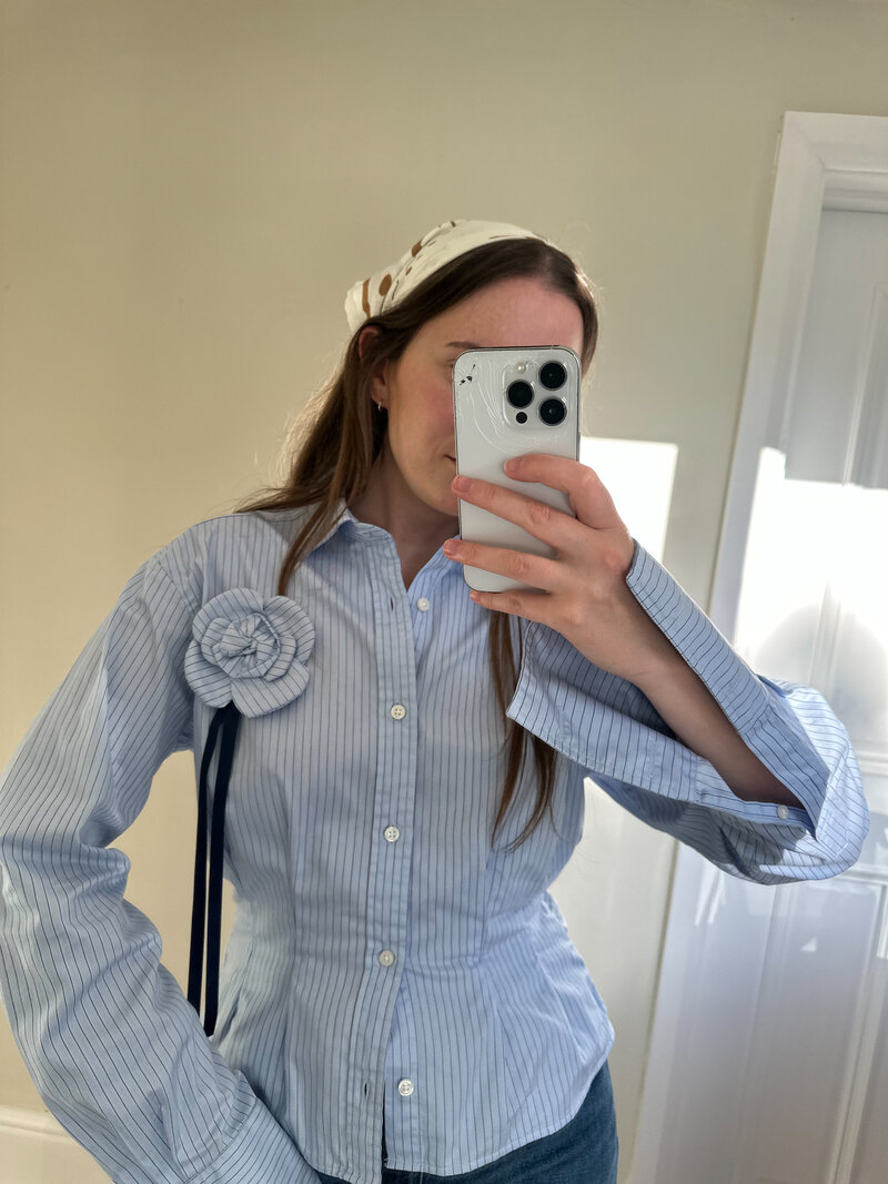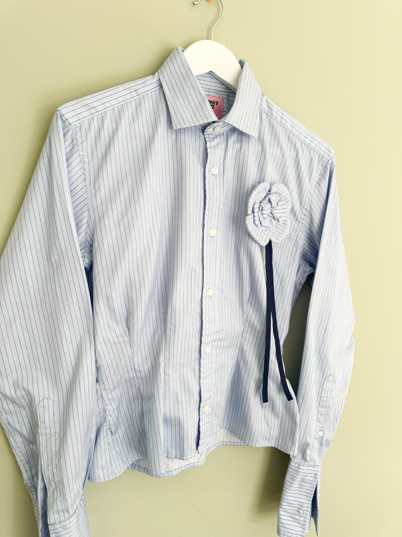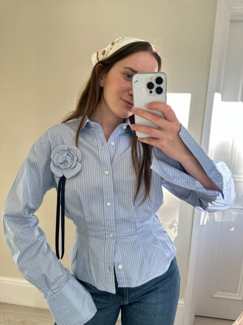 A brand new design with a darted waist to add a fitted look with matching corsage in the same fabric as the shirt this is detachable so can be worn anywhere on the shirt or on your favourite knitwear or jacket. Perfect to be styled with your favourite wide leg jeans and boots during these autumn months.