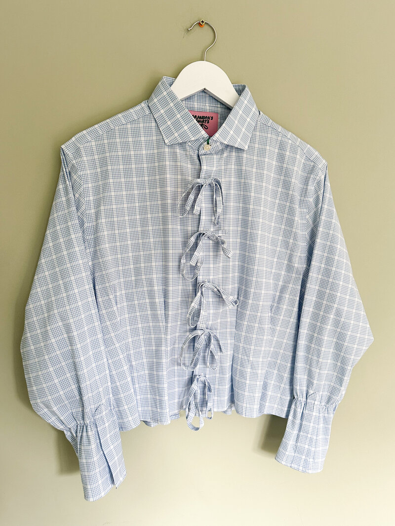 Blue check shirt with tie front detail and elasticated frill sleeves. The darted waist as a cinch waist effect.