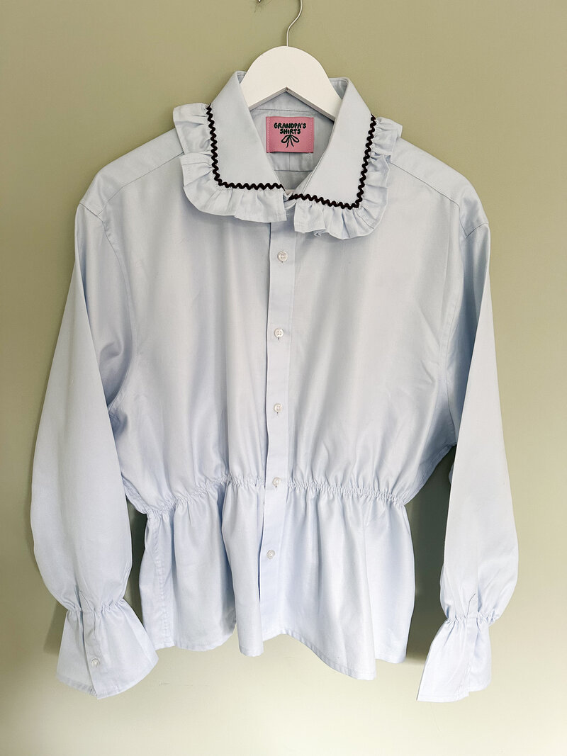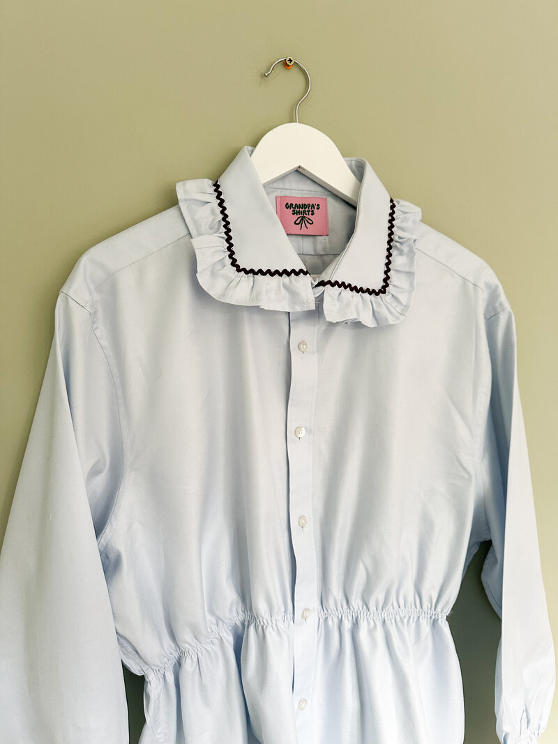 Blue shirt with brown trim and elasticated waist to create. a cinch waist effect.